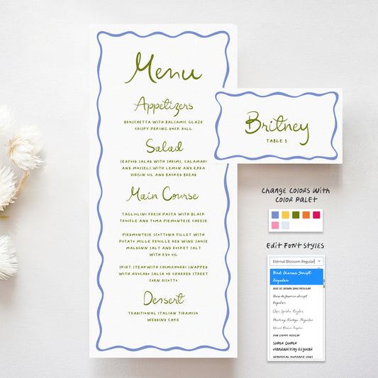 Menu + Place Card Wedding Template with Colorful Whimsical Wavy Frame